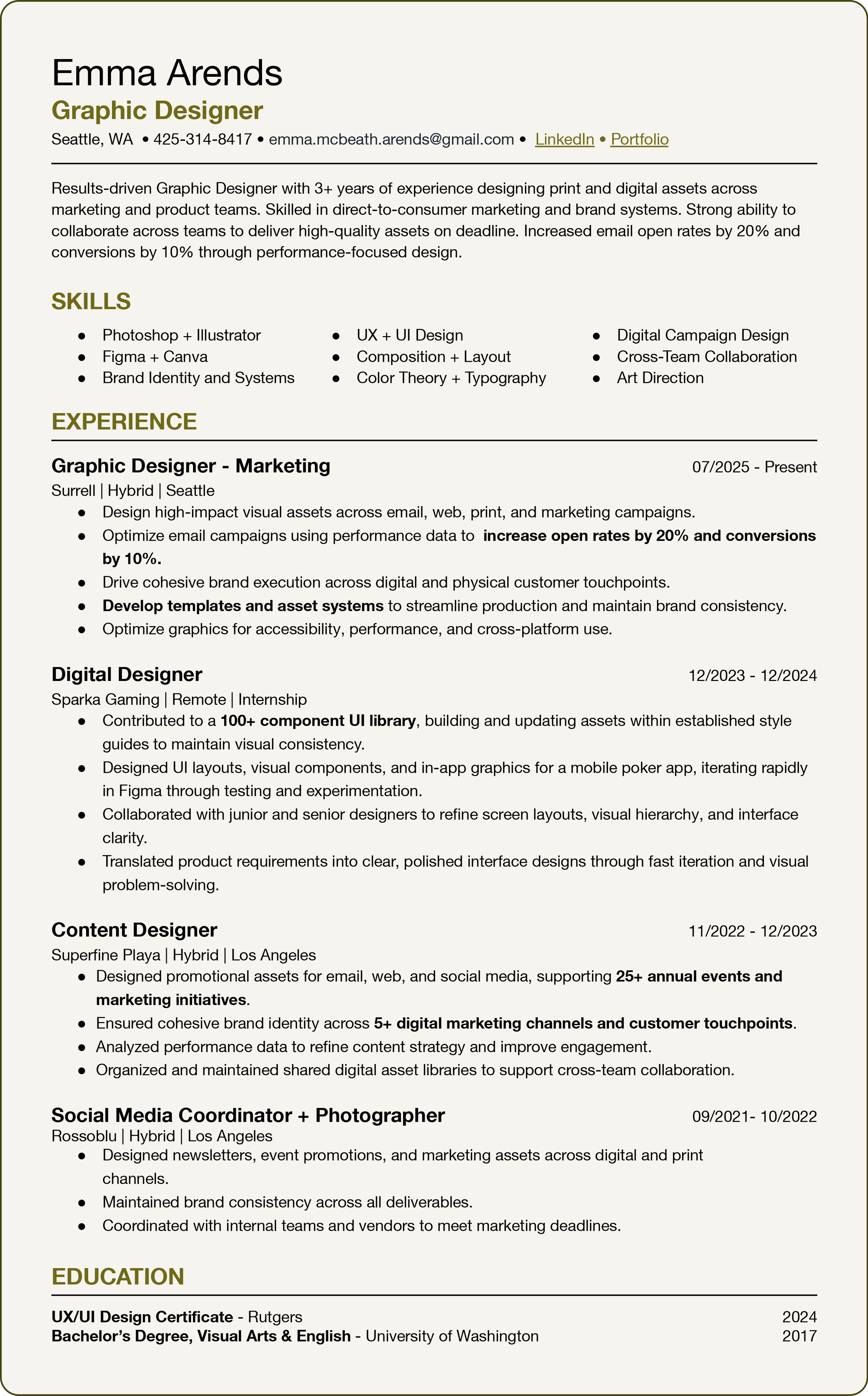 I’m a Graphic Designer with a background spanning fine art, photography, and social media management. In college I studied mixed media arts, including oil painting and photography. I later founded a photography and social media marketing business serving hospitality brands in Los Angeles before transitioning into UX and graphic design.